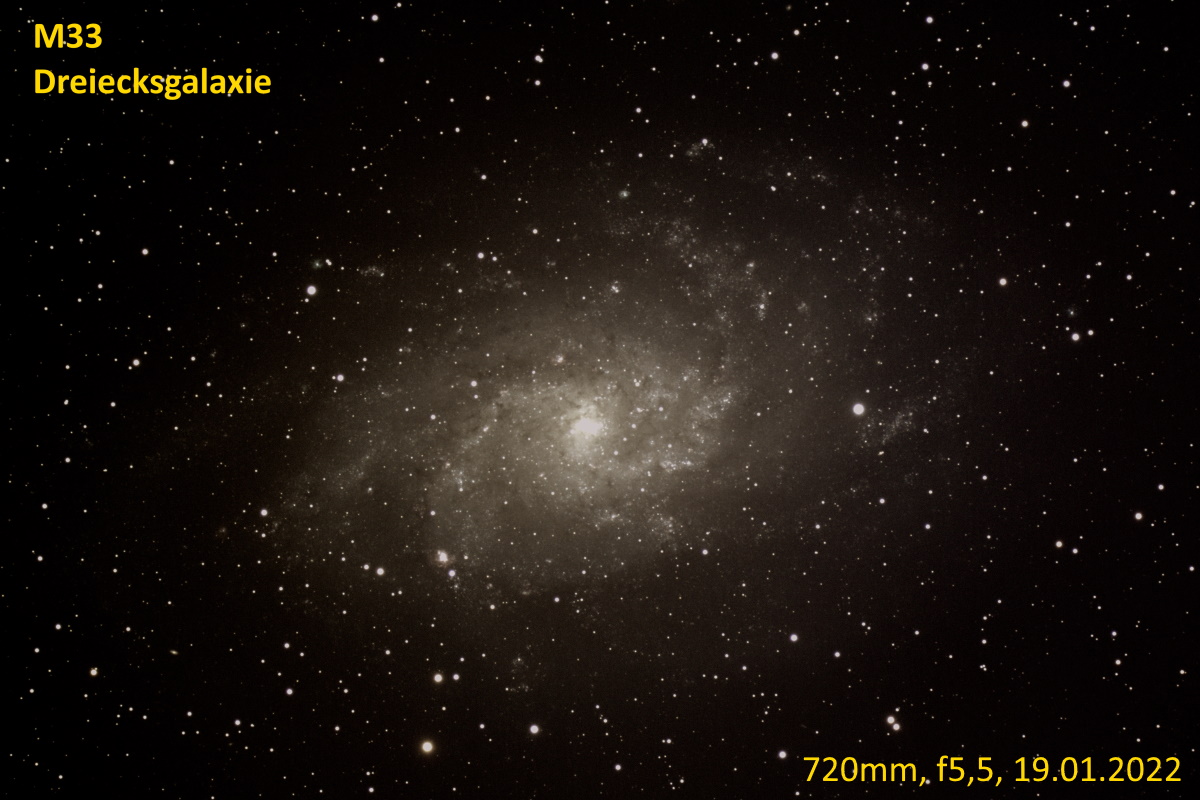 Südöstlich der Andromedagalaxie (M31) befindet sich im Sternbild Dreieck die Galaxie M33. Sie gehört ebenfalls zu den Nachbargalaxien der Milchstraße. M33 ist allerdings etwas schwerer zu beobachten. Trotzdem lohnt es sich. Die Galaxie hat sehr viele Sternentstehungsgebiete. Diese kommen erst bei fotografischen Aufnahmen richtig zur Geltung, da der Rotanteil dieser Gebiete sehr hoch ist und mit dem Auge nicht so in Erscheinung tritt, wie auf Fotografien. |