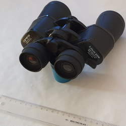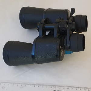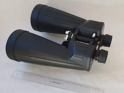 Das nächste hier gezeigte Fernglas hat eine variable Vergrößerung von 8 bis 20 fach bei einem Objektivdurchmesser von 5 Zentimetern. Diese Art von Ferngläsern spielen in der Beobachtung des Sternhimmels kaum eine Rolle, da sich das sichtbare Feld bei Veränderung der Vergrößerung ebenfalls verändert. Wird vergrößert, so verkleinert sich der Bereich im sichtbaren Feld, den man am Himmel anvisiert hat. Ein solches Instrument ist aber sehr beliebt zur Mitnahme im Auto und kann mit einer Größe von ca.19x19x5 cm noch gut untergebracht werden. |