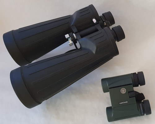 Zur Beobachtung gut geeignet, aber nicht mehr ohne Hilfe freihändig zu halten, sind Großfeld - Ferngläser mit einer Größe von 30x25x10 cm oder mehr sind sie auch nicht eben mal mit auf den Spazierweg zu nehmen. In der Regel haben diese Instrumente auch eine Möglichkeit, um sie auf einem Stativ festzumachen. Das Gewicht dieser Art von Fernglas ist ein weiterer Punkt, der eine Beobachtung ohne Hilfe eines Stativs oder wenigstens einer wackelfreien Auflage so gut wie unmöglich macht. |