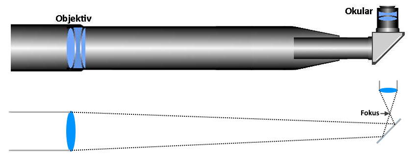 Bei einem Linsenfernrohr werden Linsengruppen (meist aus Glas) so zusammengefügt, dass die optimale Brechung (Refraktion) das Resultat zu einem vergrößerten Bild zusammenfügt. Dieses Bild wird dann mit den Augen oder einem dahinter angebrachten Fotoequipment "aufgefangen". Es wird zunächst der Lichtstrahl von einer Linse (oder einer Linsengruppe) so gebrochen, dass in einer bestimmten Strecke (Brennweite) ein möglichst idealer Fokus erreicht wird. Über eine weitere Linse (oder Linsengruppe), dem Okular, kann dann mit den Augen das vergrößerte Abbild des anvisierten Bildes betrachtet werden. Anstatt des Okulars ist es auch möglich Fotoequipment einzusetzen, das die Bildebene dann im Fokus auffangen und auf Fotopapier oder digital speichern kann. |