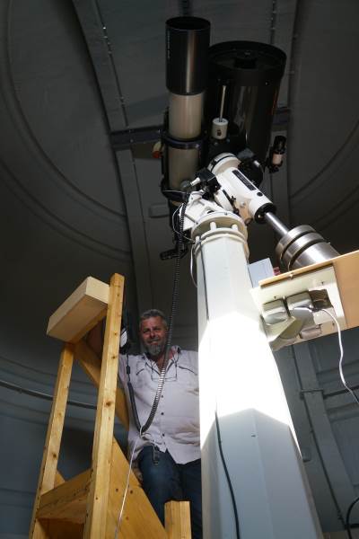 Das Bild hier zeigt Heiner Soltau, den Manager der Onjala Lodge in der Kuppel mit Zeiss Refraktor und C14.