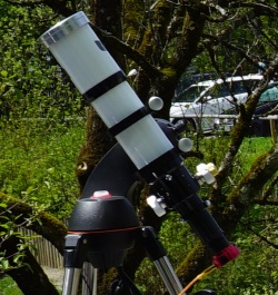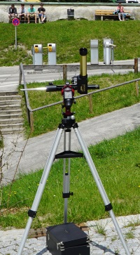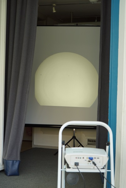 Als weitere Hilfe wurde durch einen Refraktor mit Sonnenfilter ein Livebild aufgenommen und über den PC mittels Beamer allen zugänglich gemacht, die gerade nicht durch eines der bereitstehenden Teleskope blicken konnten.