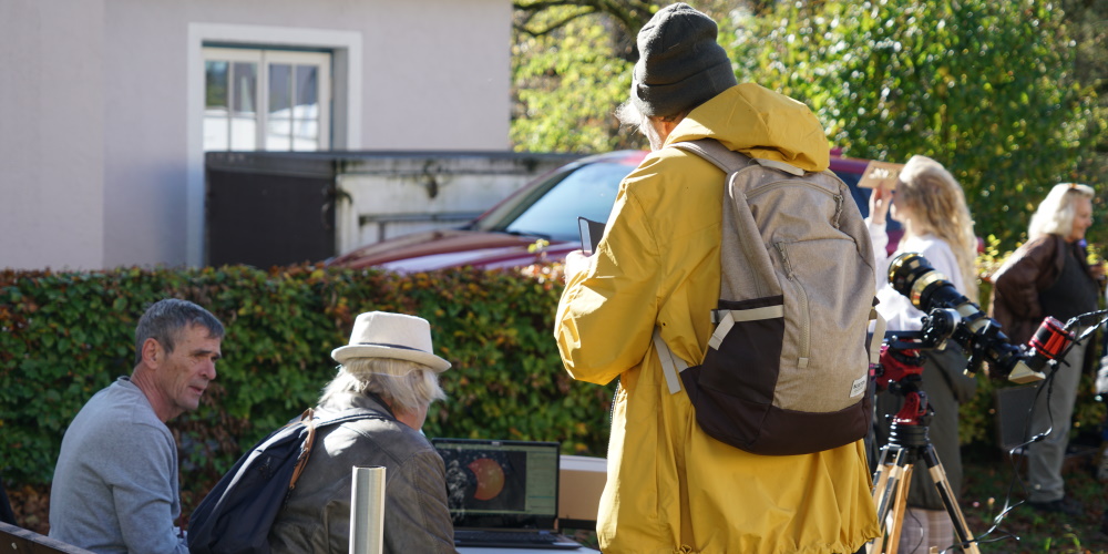 Das spezielle Sonnenteleskop wurde mit einer Astrokamera bestückt. Das Bild konnte so mehreren Personen durch die Projektion auf 2 Bildschirmen gleichzeitig gezeigt werden.