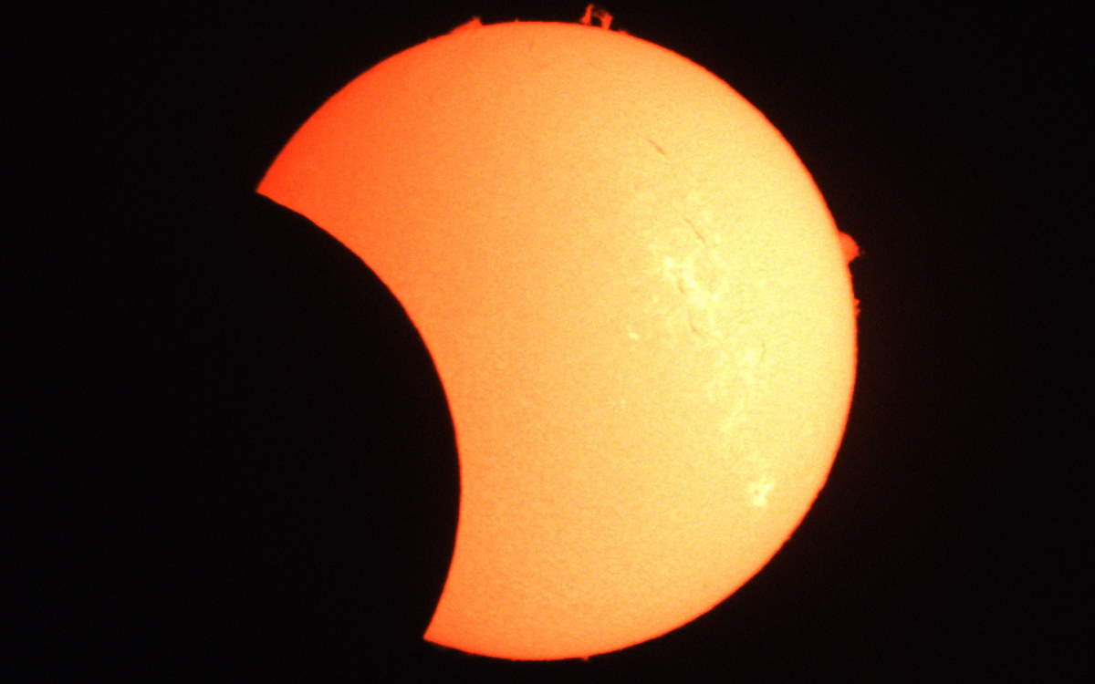 Doch um ca. 11:30 Uhr wird unser Warten belohnt. Die Wolken ziehen nach Osten ab und der Himmel öffnet sich für das Schauspiel der partiellen Sonnenfinsternis. Bis ca. 12:15 werden 25 % der Sonne durch den vorbeiziehenden Mond bedeckt. Danach zieht er wieder ab und gibt die Sicht auf die Sonne wieder frei. Hier der Anblick um ca. 12:30 Uhr.